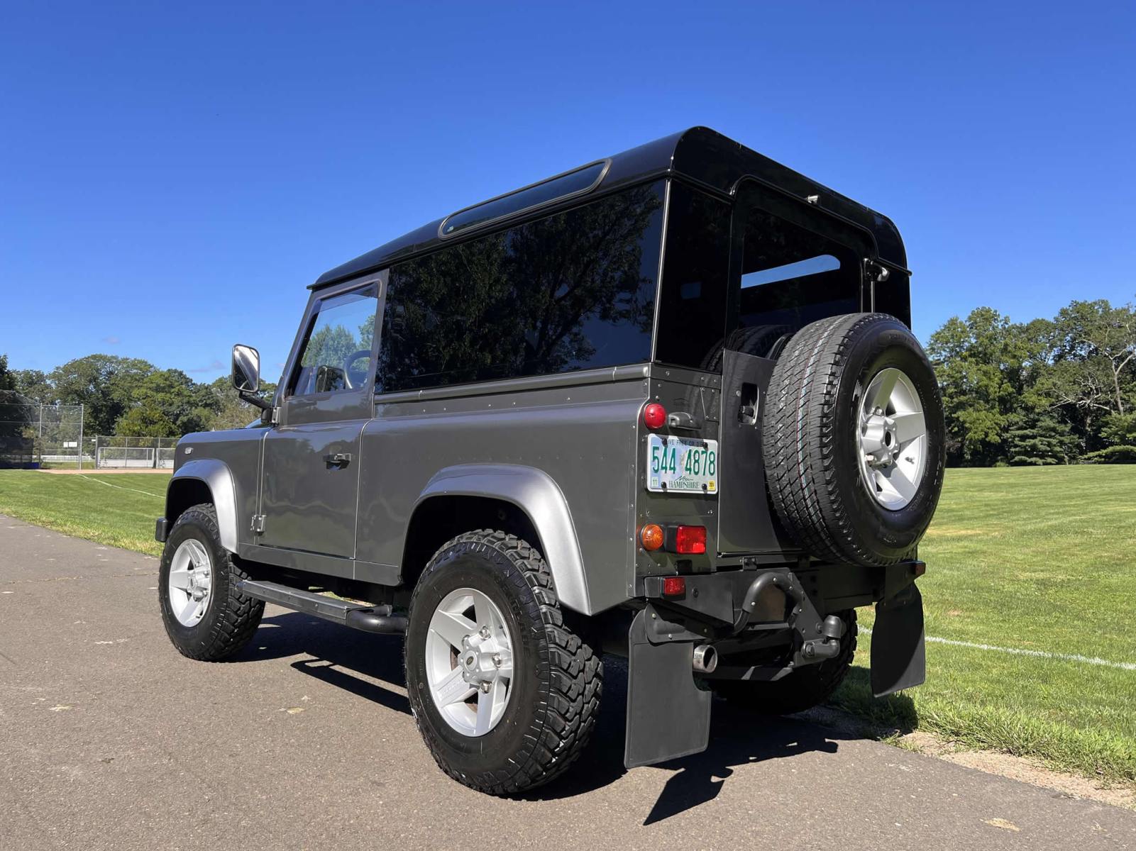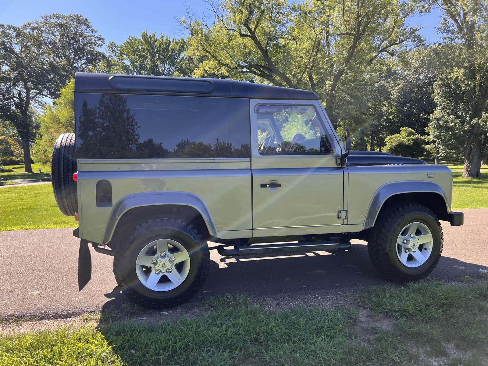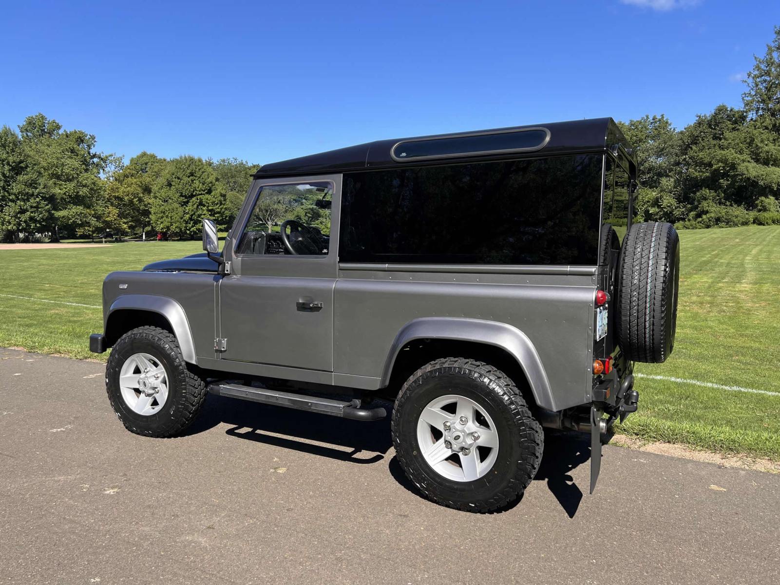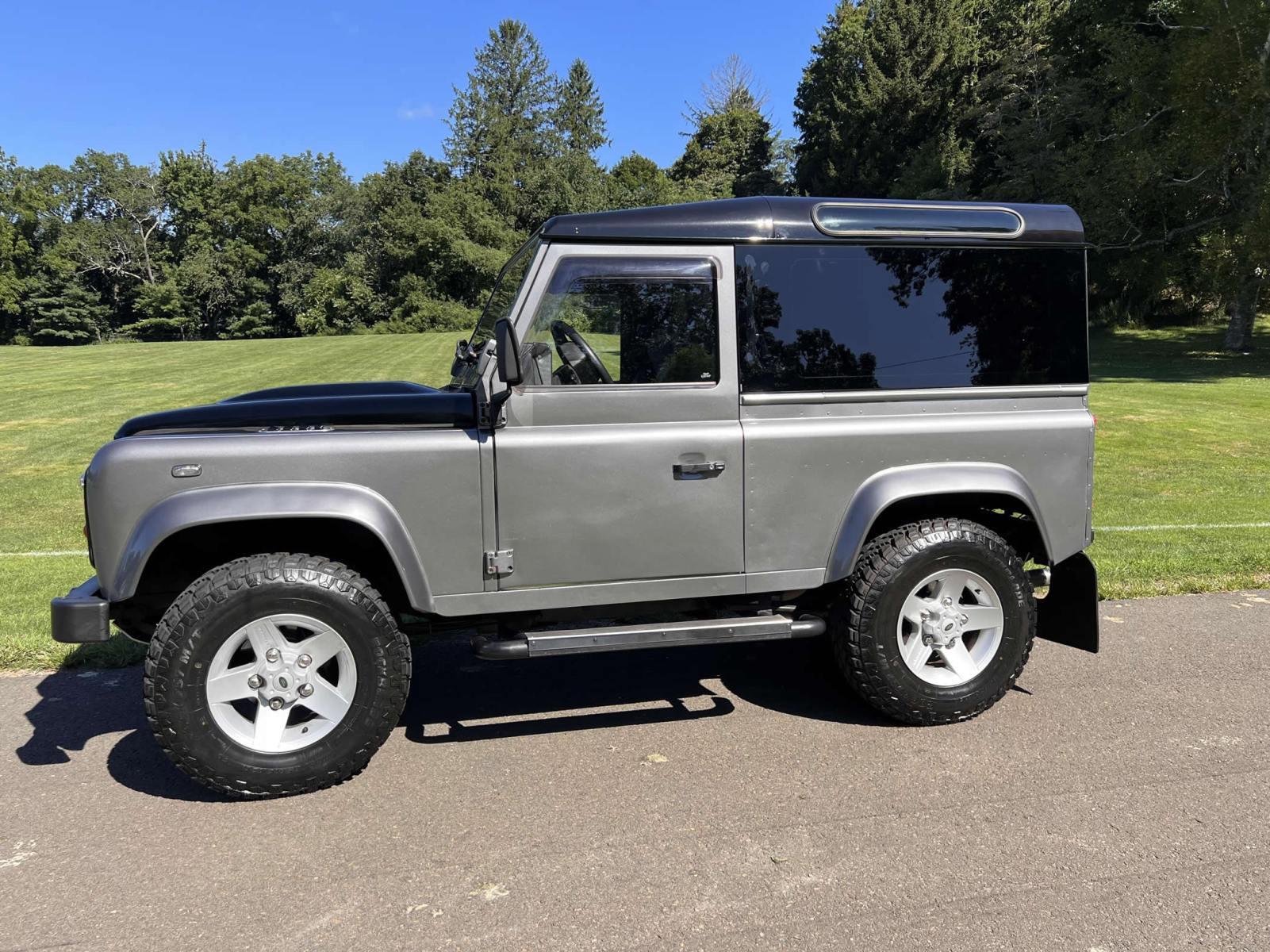 THIS… is a 1997 Land Rover Defender 90, finished in gray and black with a panoramic glass-roof hard top and a black interior.